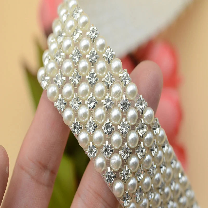 Kristalle AB Perlenbesatz Applikation zum Aufbügeln auf Kleidung, Kleider, Basteln, 3-reihig, 6-reihig, 1 Meter